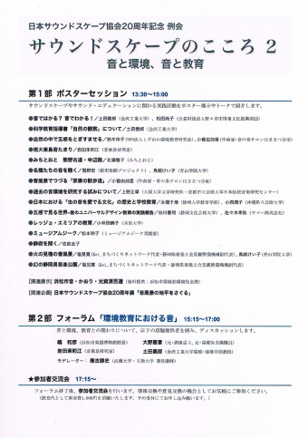 2014年3月22日に、浜松市で開催された日本サウンドスケープ協会20周年記念の例会「サンドスケープのこころ2」〜音と環境、音と教育〜 に、ポスターセッションで参加させていただきました。長年にわたってサウンドスケープに取組んでおられる方々のお話を伺って、学ぶところ多くありました。サウンドスケープって、深いなぁと思った次第です。
